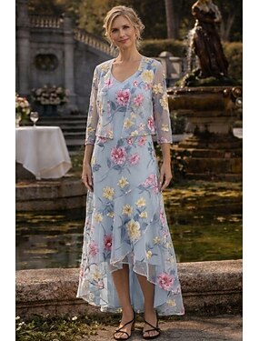 Due Pezzi Linea ad A Lunghezza Tè Abito da invitata a nozze Abito da cerimonia per signora Manica Corta Scollo a V Elegante Taglie Forti Ospite di nozze Ricevimento di matrimonio Chiffon Con Stola