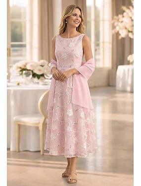 Tre Pezzi Lunghezza Tè Abito Midi Abito da cerimonia per signora Manica Lunga Scollo Tondo Elegante Vintage Formale Ospite di nozze Semi-Formale Chiffon Jacquard Con Stola con A mantellina Fiore