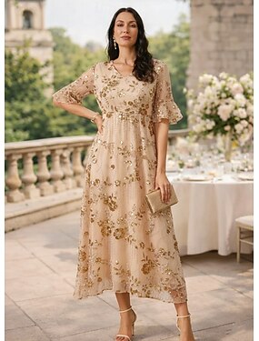 Linea ad A Lunghezza Tè Vestito da Festa Abito da Cocktail Abito da invitata a nozze Abito da cerimonia per signora Mezza Manica Scollo a V Elegante Minimalista Ospite di nozze Cocktail party Serata
