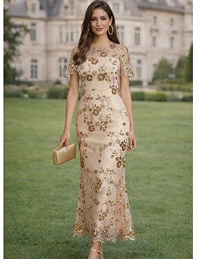Tubino Colonna Lunghezza Tè Abito in Pizzo Abito Formale Abito Floreale Abiti da Cocktail Elegante Vintage Brillanti Manica Corta Scollo Illusione Festa in giardino Matrimonio Chiffon Tulle Shiena
