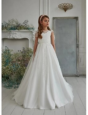 Linea ad A Strascico a Terra Abito da damigella d'onore bambina Prima comunione Ragazze Abito da ballo carino Raso con Perline Elegante Misura 3-16 anni