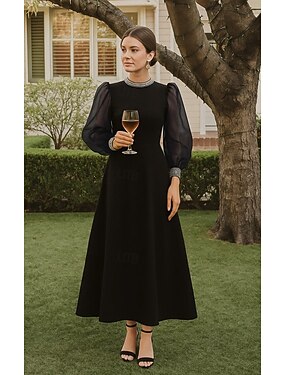 Linea ad A Lunghezza Tè Abiti da Cocktail Abiti da festa Abito svasato Elegante Manica Lunga Girocollo Festa in giardino Matrimonio Crepe Elasticizzato con Cristalli