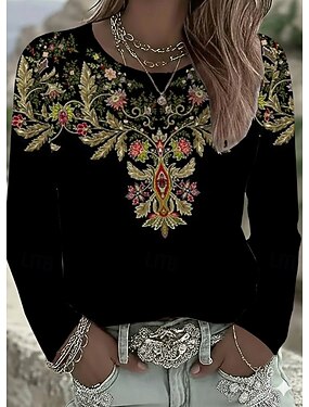 Per donna Maglietta Floreale Grafico Paisley Vintage Elegante Classico Manica Lunga Girocollo Top Regolari Quotidiano Stampato Bianco / Nero Nero Rosso Arancione Oro Primavera Autunno Inverno