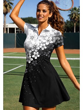 Per donna Sfumatura Floreale Abito da tennis Abito sportivo Manica Corta Floreale Stampato Traspirante Tennis Golf Badminton Colletto Colletto Polo Vestito Nero con Bianco Abbigliamento da tennis