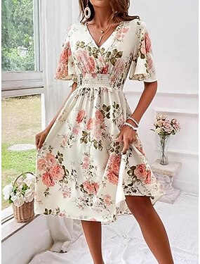 Per donna Vestito longuette Abito casual Vestito svasato Abito linea A Moda Informale Da mare Giornaliero Standard Floreale Manica corta A V Nero Bianco Giallo Rosa Estate