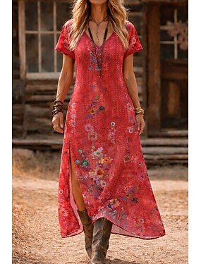 Per donna Abito lungo maxi Abito Boho Vestito Casual Vintage Quotidiano All'aperto Spiaggia Vestibilità comoda Floreale Manica Corta Collo a U Rosa Verde militare Blu marino Estate Primavera