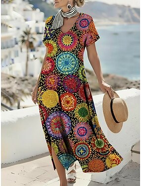 Per donna Abito maxi Abito a trapezio Vacanza Casual All'aperto Uscire Vestibilità regolare Floreale Grafico Manica Corta Scollo a V Nero Bianco Marrone Verde Estate Primavera