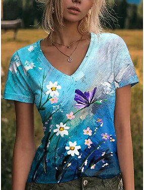 Per donna Maglietta Stampato Floreale Grafico Vintage Elegante Classico Manica Corta Scollo a V Top Regolari Casuale Quotidiano Uscire Blu Verde Estate Primavera