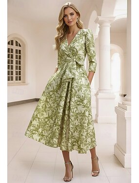 Linea ad A Lunghezza alla caviglia Lunghezza Tè Abito Formale Abiti da Cocktail Elegante Manica 3/4 Scollo a V Matrimonio Formale Organza Jacquard con Stampa floreale