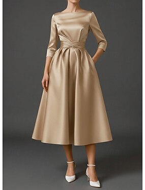 Linea ad A Lunghezza Tè Abiti da Cocktail Elegante Manica 3/4 Scollo a Barca Matrimonio Ospite di nozze Raso Elasticizzato con Pieghe Arricciato