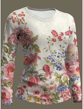 Maglietta da donna a maniche lunghe colletto rotondo a maniche lunghe tunica grafica floreale piante vintage stilosa classica colletto rotondo tops regolari stampa quotidiana nera bianca rosa viola