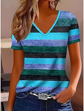 Per donna Maglietta Stampato A strisce A righe Bohemien Vintage Elegante Manica Corta Scollo a V Top Regolari Quotidiano Blu Rosa Estate Primavera