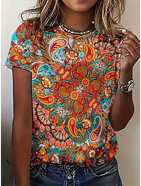 Per donna Maglietta Stampato Floreale Grafico Paisley Bohemien Vintage Elegante Manica Corta Girocollo Top Regolari Quotidiano Uscire Weekend Blu Nero Viola Arancione Verde Estate Primavera