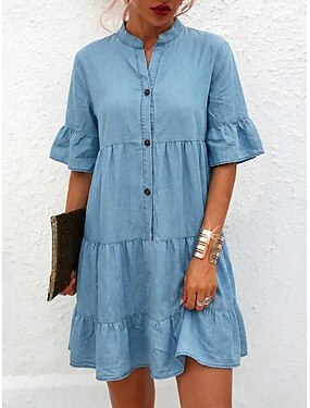 Per donna Mini abito Vestito Casual Abito a trapezio Abito in finto denim Moda Essenziale Quotidiano All'aperto Vacanza Vestibilità comoda Semplice Manica Corta Collo alla coreana Azzurro Estate