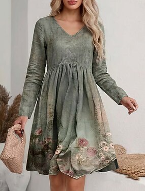 Abito Maxi da Donna Abito A Line Abito Pieghettato Abito Fit And Flare Boho Data Regolare Fit Grafica Floreale Manica Lunga V Collo Verde Primavera Autunno Inverno