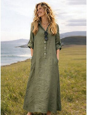 Per donna Abito maxi Finto cotone e lino Abito Camicia Vestito Casual Essenziale Casual Quotidiano Vacanza Vestibilità regolare Semplice Manica Lunga Colletto a Camicia Rosa Verde Grigio Primavera