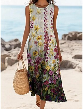 Per donna Abito Midi Finto cotone e lino Abito a trapezio Casual Quotidiano Vestibilità regolare Semplice Senza Maniche Girocollo Blu marino Arancione Beige Grigio Estate Primavera