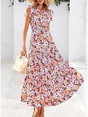 Per donna Abito Midi Abito Floreale Abito con Collo Allacciato Abito Stampato Moda Moderno All'aperto Vacanza Uscire Vestibilità comoda Floreale Senza Maniche All'americana Blu Magenta Verde chiaro