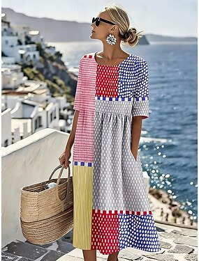 Per donna Abito Midi Abito a trapezio Casual Spiaggia Vestibilità regolare Grafico Geometrico Manica Corta Girocollo Blu Giallo Rosso Viola Estate Primavera