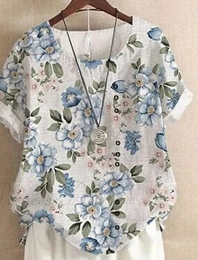 San Valentino Per donna Camicia Blusa Finto cotone e lino Stampato Floreale Grafico Vintage Elegante Casual Manica Corta Girocollo Top lunghi Quotidiano Azzurro Estate Primavera