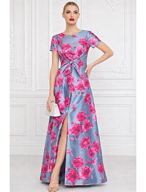 Linea ad A Lunghezza al pavimento Abito da Sera Da principessa Abito formale Elegante Spacco Alto Manica Corta Collo quadrato Matrimonio Formale Tasca Raso con Stampa floreale Spacco Tasca