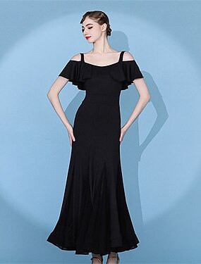 abito da ballo da sala con volant e spalle scoperte per donna - elegante abito a trapezio per competizioni, balli latini ed eventi di danza - nero