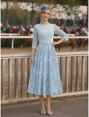 Linea ad A Lunghezza Tè Abito da invitata a nozze Abito da cerimonia per signora Manica 3/4 Bavero Elegante Vintage Brillare & Splendere Formale Ospite di nozze Derby del Kentucky Chiffon Jacquard con