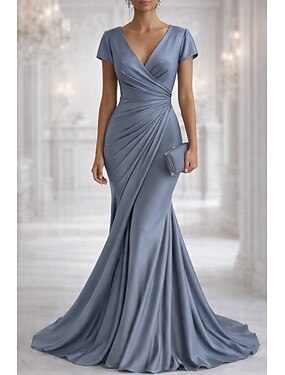 Sirena Tromba Lunghezza al pavimento Abito da Sera Elegante Manica Corta Scollo a V Matrimonio Formale Raso Elasticizzato Shiena scoperta con Pieghe