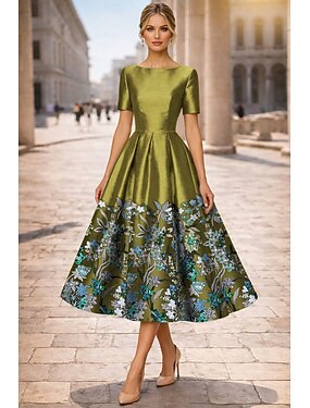 Linea ad A Lunghezza Tè Abito Formale Abiti da Cocktail Elegante Manica Corta Scollo a Barca Matrimonio Formale Taffetà con Con perline Pieghe