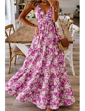 Per donna Abito maxi Abito Boho Vestito Estivo Vestito Casual Abito Etnico Elegante Bohemien Vacanza Spiaggia Ferie Data Vestibilità regolare Floreale Grafico Senza Maniche Scollo a V Blu Rosa Viola