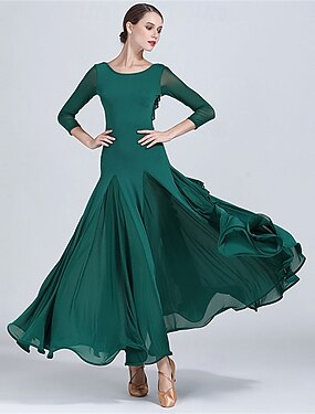 abito da ballo da sala verde per donna - abito a trapezio con maniche lunghe e gonna fluida per gare, balli latini ed eventi di danza