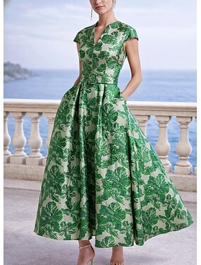 Linea ad A Lunghezza alla caviglia Abiti da Cocktail Elegante Floreale Manica Corta Scollo a V Festa in giardino Matrimonio Tasca Jacquard con Stampa floreale Pieghe Tasca