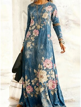 Per donna Abito Lungo Maxi Abito Vestito Casual Vestito a ruota Abito Boho Vintage Quotidiano All'aperto Weekend Vestibilità regolare Floreale Manica Lunga Girocollo Blu Primavera Autunno Inverno