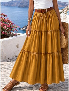 Per donna Gonna da vacanza Moda Casual Maxi Vita Alta Gonne Tinta unita Arricciato Coulisse Volant Inelastico Quotidiano Vacanza Blu Lilla Nero Giallo Estate Cotone e Lino Poliestere