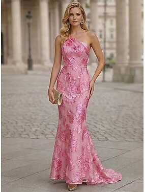 Sirena Tromba Strascico a Terra Abito da Sera Elegante Pastello Senza Maniche Monospalla Festa serale Matrimonio Organza Jacquard con Blocco di Colore