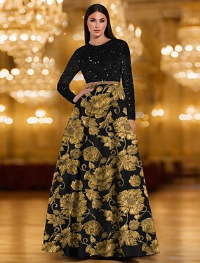 Linea ad A Lunghezza al pavimento Abiti da Ballo Abito da Sera Da principessa Elegante Manica Lunga Scollo a V Matrimonio Formale Raso Jacquard con Stampa floreale Arricciato Tasca