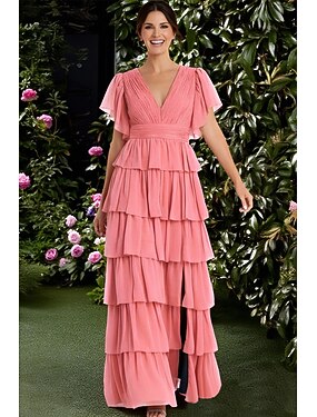 Abito da ballo Lunghezza al pavimento Abito Formale Abito da sera Abiti da Ballo Elegante Festa Manica Corta Scollo a V Festa in giardino Matrimonio Chiffon con Volant