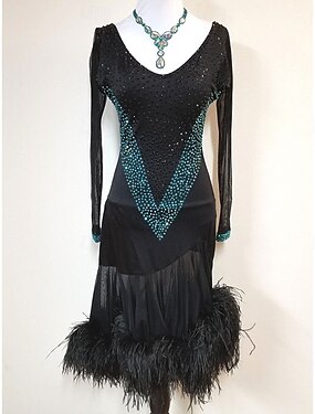 abito da ballo latino nero da donna con scollo a V con perline, orlo di piume e dettagli in strass di cristallo per salsa, tango e abbigliamento da spettacolo