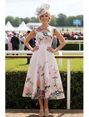 Linea ad A Lunghezza alla caviglia Abito Derby Abito da cerimonia per signora Senza Maniche Scollo Tondo Elegante Vintage Derby del Kentucky Raso con Stampa floreale Fiore Stampa