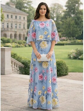 Linea ad A Abito Lunghezza al pavimento Vestito da Festa Abito da Cocktail Abito da cerimonia per signora Mezza Manica Scollo a Barca Elegante Vintage Formale Ospite di nozze Ferie Chiffon con Stampa