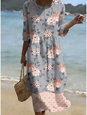 Per donna Abito Midi Vestito Estivo Abito Estivo Vacanza Casual Boho Spiaggia Ferie Vestibilità comoda Floreale Grafico Manica 3/4 Girocollo Blu Bianco Rosa Estate Primavera