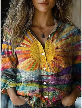 Per donna Camicia Finto cotone e lino Bottoni Stampato Sole Bohemien Vintage Elegante Manica Lunga Colletto a Camicia Top Regolari Quotidiano Ferie Blu Rosso Viola Fucsia Arancione Primavera Autunno