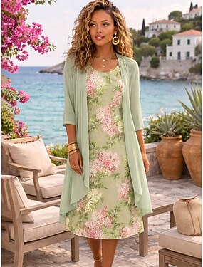 Per donna Insieme del vestito Abito a trapezio Elegante Vacanza Floreale Grafico Stratificato Stampato Abito Midi Mezza Manica Girocollo Quotidiano Verde Beige Estate Primavera Vestibilità regolare