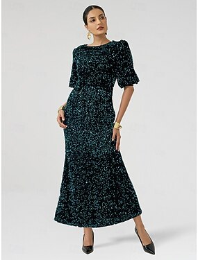 abito lungo elegante e scintillante con maniche a sbuffo in paillettes e velluto