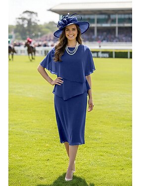 Abito da cocktail Sheath Ospite di matrimonio Elegante Semplice Scollo gioiello Corto Mini Chiffon Maniche corte con Fiocchi Colore solido Abiti taglia personalizzata gratuita