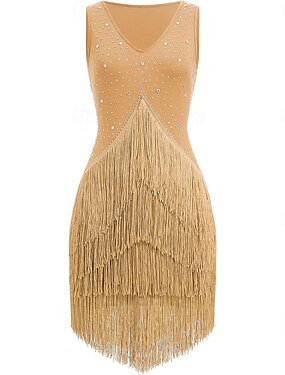 abito da ballo latino da donna con frange in strass dorati - senza maniche, spalle scoperte, multistrato, asimmetrico, per spettacoli da ballo da sala