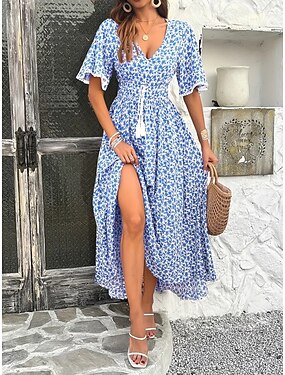 Per donna Abito Lungo Maxi Abito Abito a trapezio Abito Floreale Elegante Moda Moderno Quotidiano All'aperto Vacanza Vestibilità regolare Floreale Manica Corta Scollo a V Blu Nero Marrone Estate