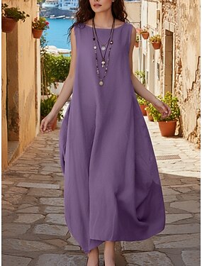 abito lungo maxi da donna 100% cotone, abito boho, abito a tubino, prendisole, moda, classico, moderno, per esterni, vacanze, per uscire, vestibilità regolare, tinta unita, senza maniche, girocollo, viola, marrone, blu scuro, estate, primavera