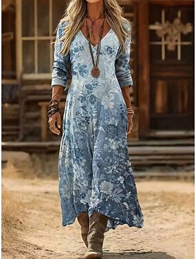 Abito lungo da donna, abito lungo, abito boho, abito casual, abito scampanato, abito estivo, vintage, vacanza, quotidiano, spiaggia, vestibilità regolare, floreale, manica lunga, scollo a V, blu, estate, primavera, autunno.