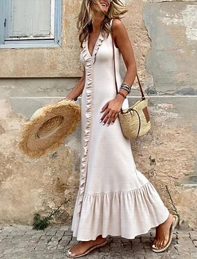 abito lungo da donna in finto cotone e lino, abito a trapezio casual da giorno vestibilità ampia tinta unita maniche corte scollo a V blu nero bianco cammello estate primavera autunno